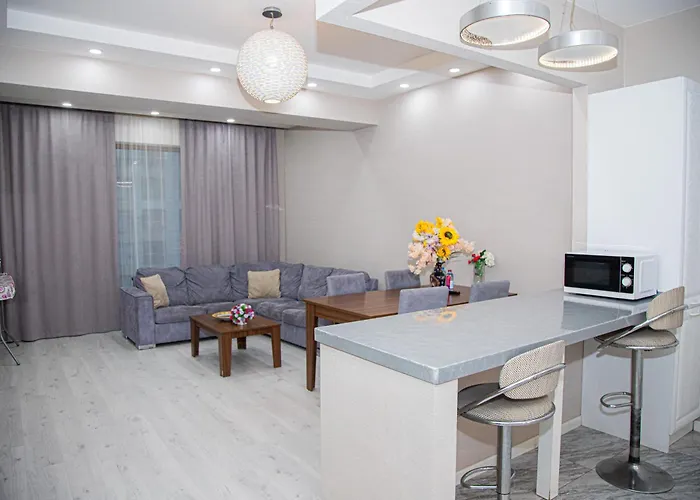 The 95 m² Park Azure By Aztur 0130 Apartment Baku is located around a 25-minute walk from the Heydar Aliyev Center and 2.3 km from the Upmarket Port Baku Shopping Mall. A terrace, along with a private garden, is featured at this spacious apartment.